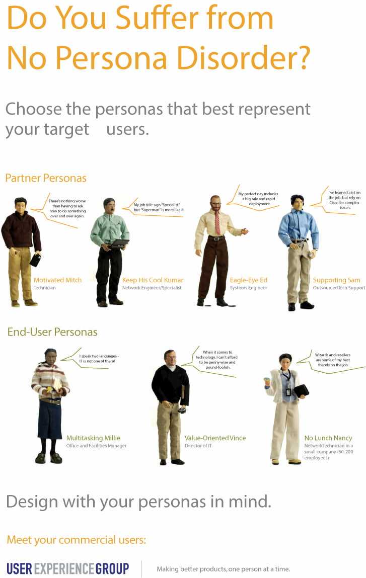 When people say “you don’t understand; you can’t do it that way,” you need to consider valid concerns, but then find the best way to work around those concerns and drive hard to your larger goal. By nature, innovative ideas represent new ways of thinking, which means you need to drop old ways of thinking and operating. Several "experts" criticized our personas, saying that by showing our customers as dolls, we did not respect them. Quite the contrary: We polled numerous customers, and most of them saw the humor in representing users as action figures. Several even thought we should take it farther and represent them as Action Heroes, with capes and disguises! Rather, I found that in the UX industry, we have a large number of purists who articulate how things should be, and others line up behind them, fearful of trying anything new. In the end, should we use non-human characters to represent personas? Honestly, I am not attached to representing them in any way. The key here is that these personas representations engaged product teams in a dialog about users in a way human characters had not to that point. They created a stickiness, and ensured that product teams developed solutions based on having internalized the characteristics of these archetypical users.