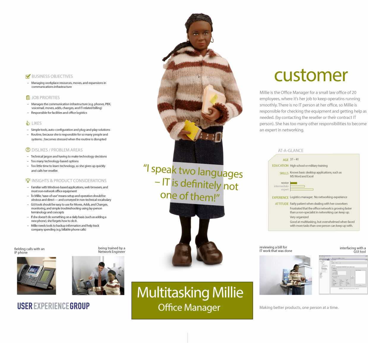 To craft each persona we of course gathered significant research to understand user characteristics, business objectives, priorities, likes, dislikes, and insights or product considerations. We then defined example physical characteristics of each persona, based on actual people in the roles that the persona represented. We also identified key accessories they carry with them. For example, we highlighted the types of clothes they might wear, the type of briefcase they might carry, the type of cup or mobile phone they might carry, and so on. We then had these personas built as action figures (yeah, dolls), along with these accessories, leveraging a company we worked with in China.