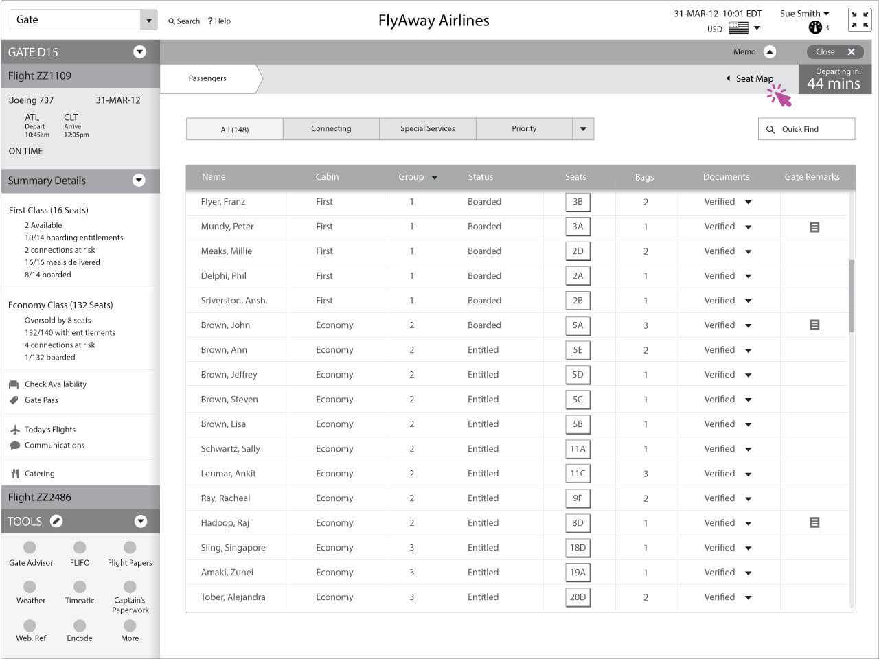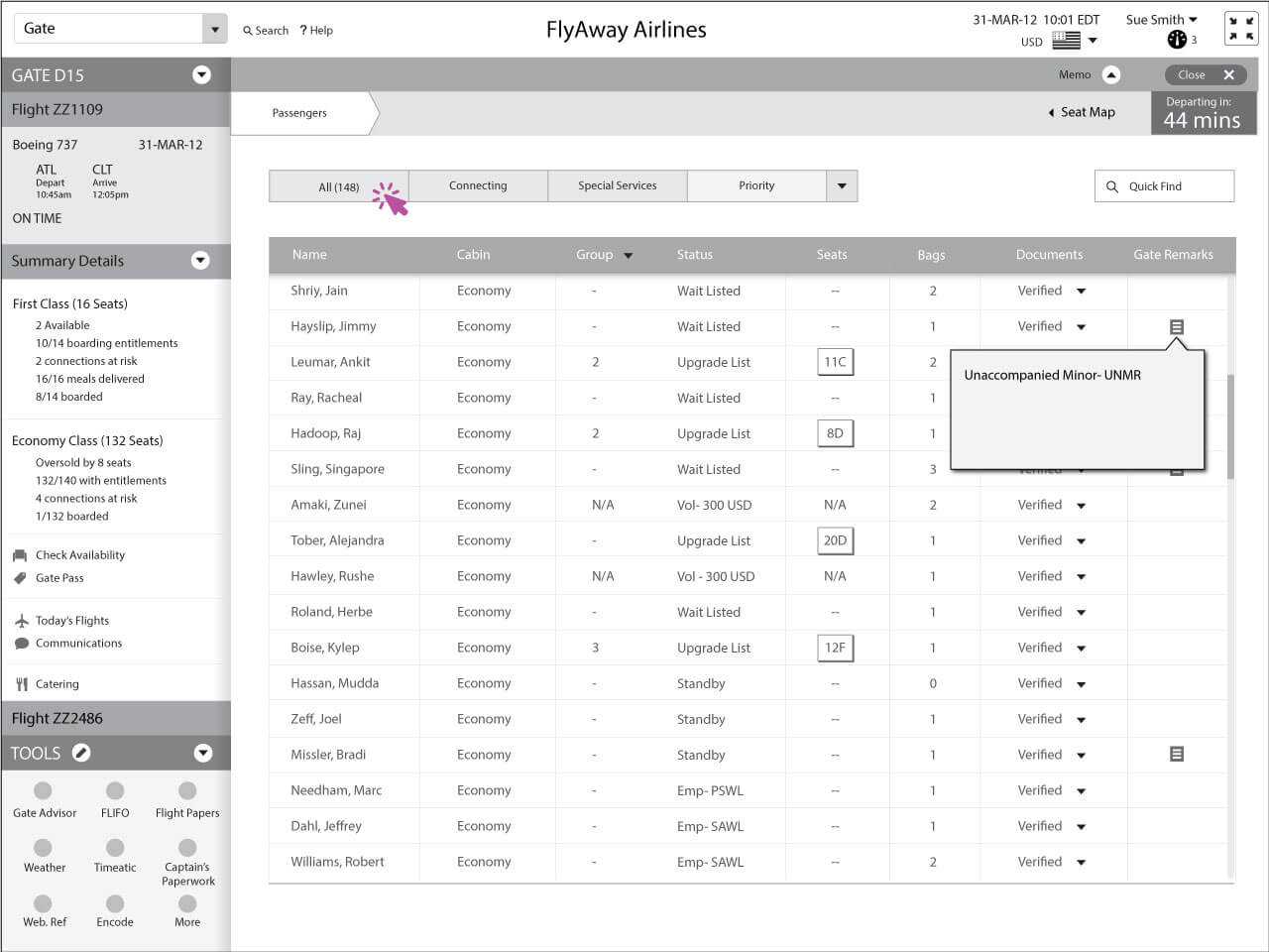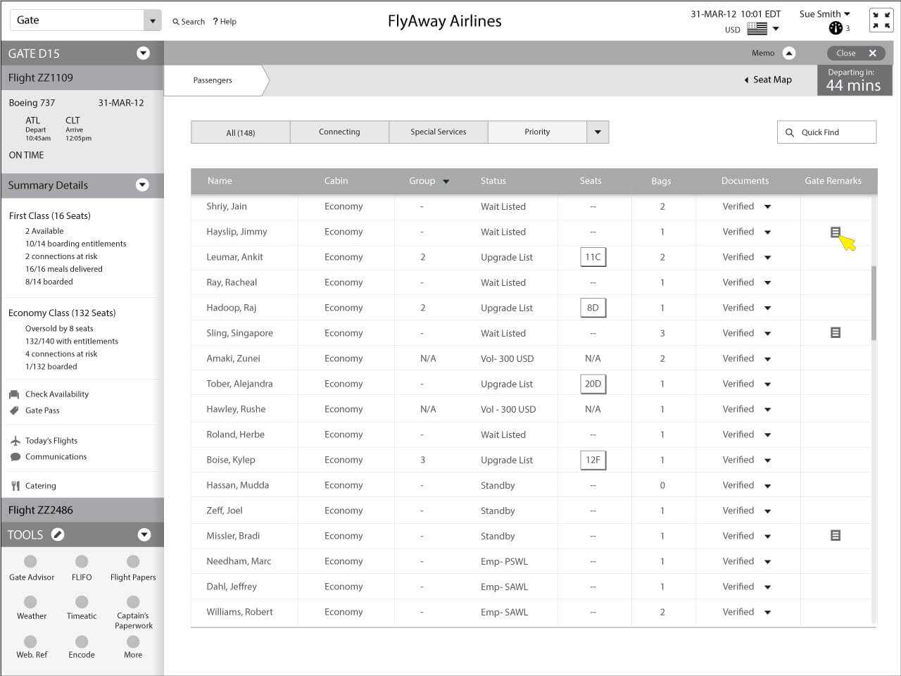 Sue dismisses the seat map and hovers over the Gate Remarks for passenger Jimmy Hayslip.