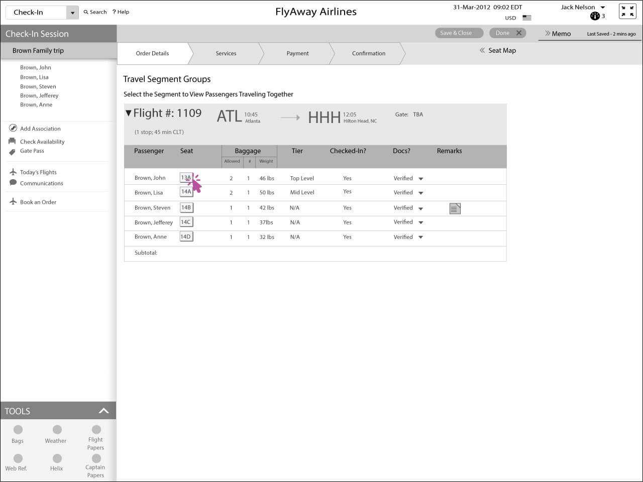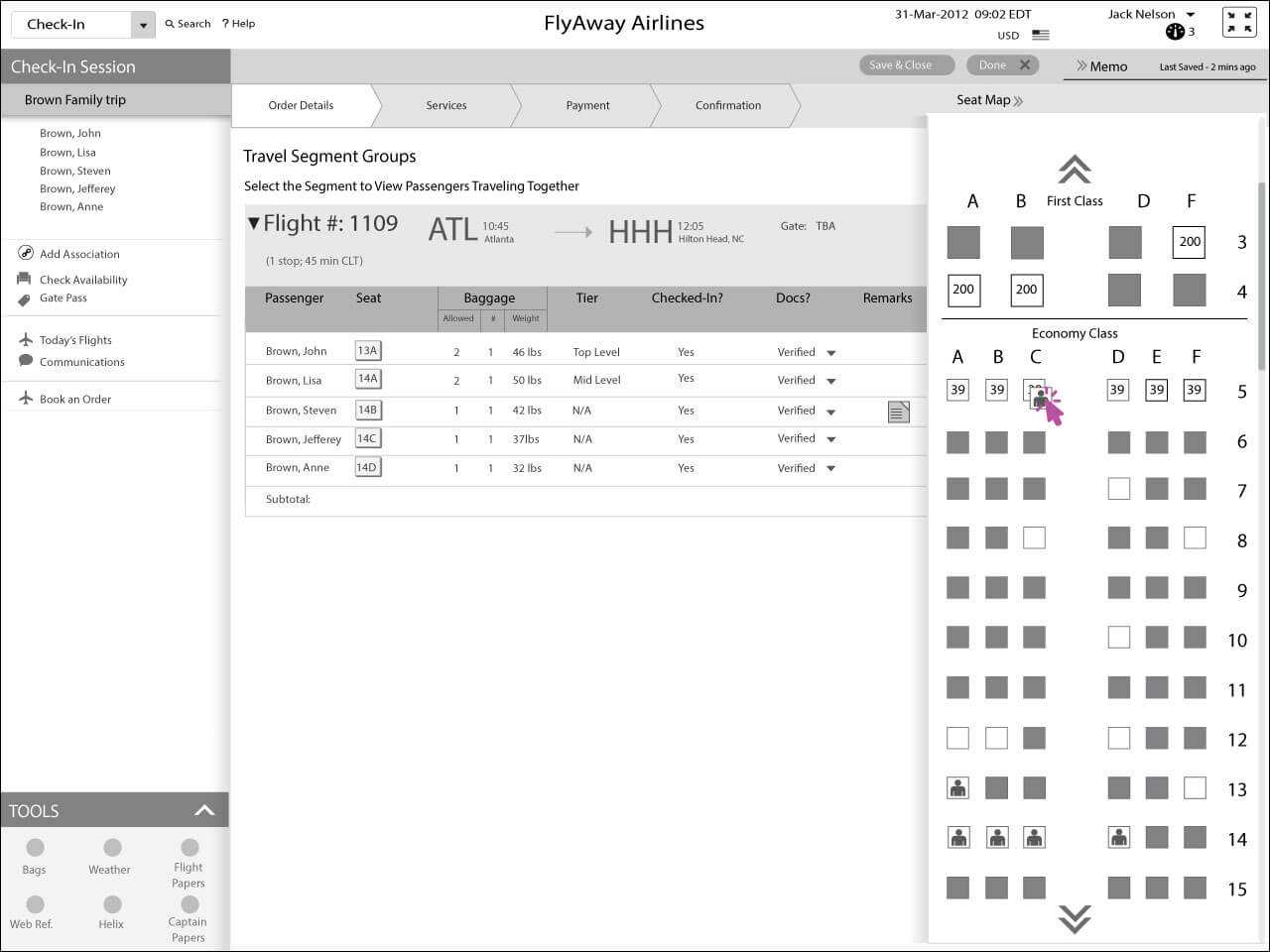 Jack is able to drag each passenger to a new seat, so they can sit together. Note that this process significantly improves the process the agent would typically follow, where they have to enter a screen for each passenger separately and type a new seat number. This way, the agent can move all passengers to new seats all at once. The original plan was to enable the system to automatically seat passengers together if the agent clicked a button, but we could not get that functionality added in an early release.