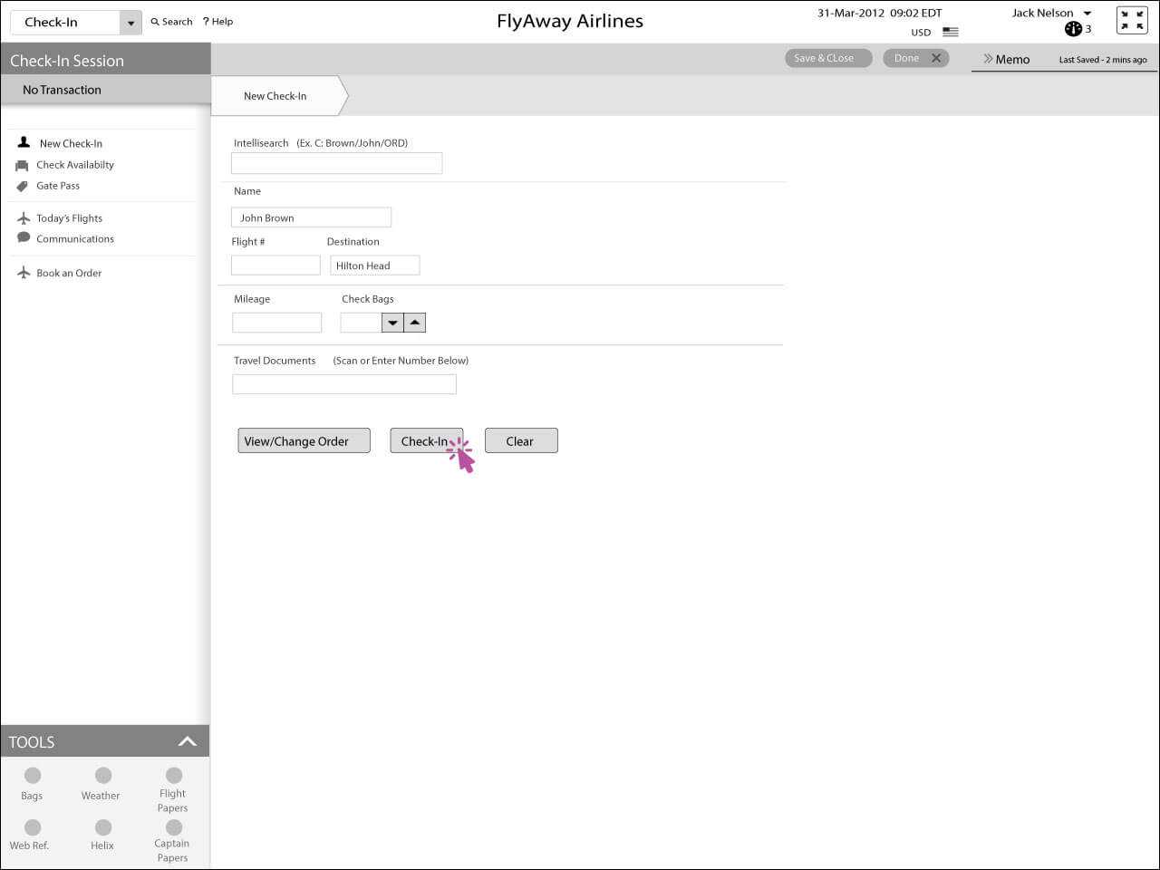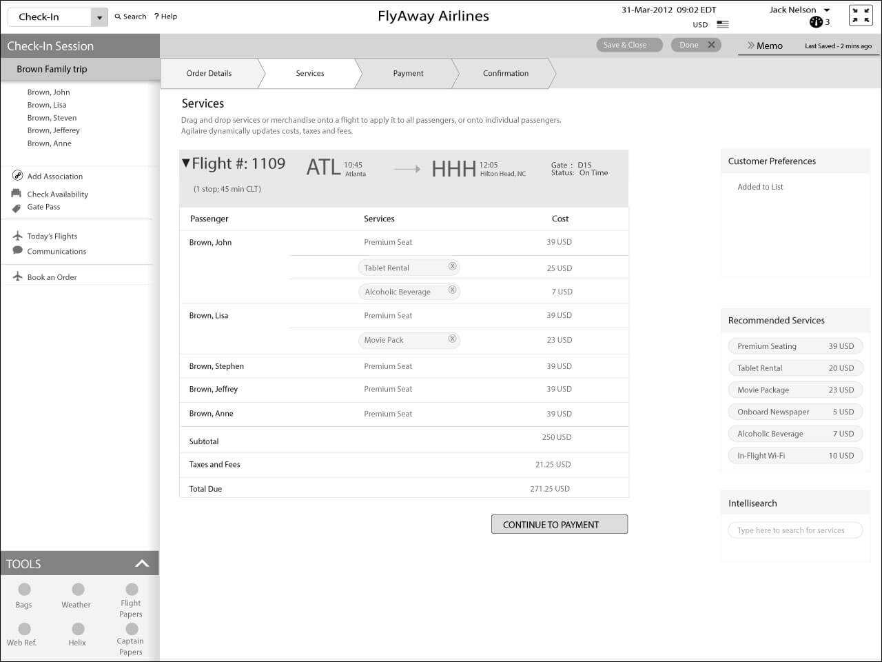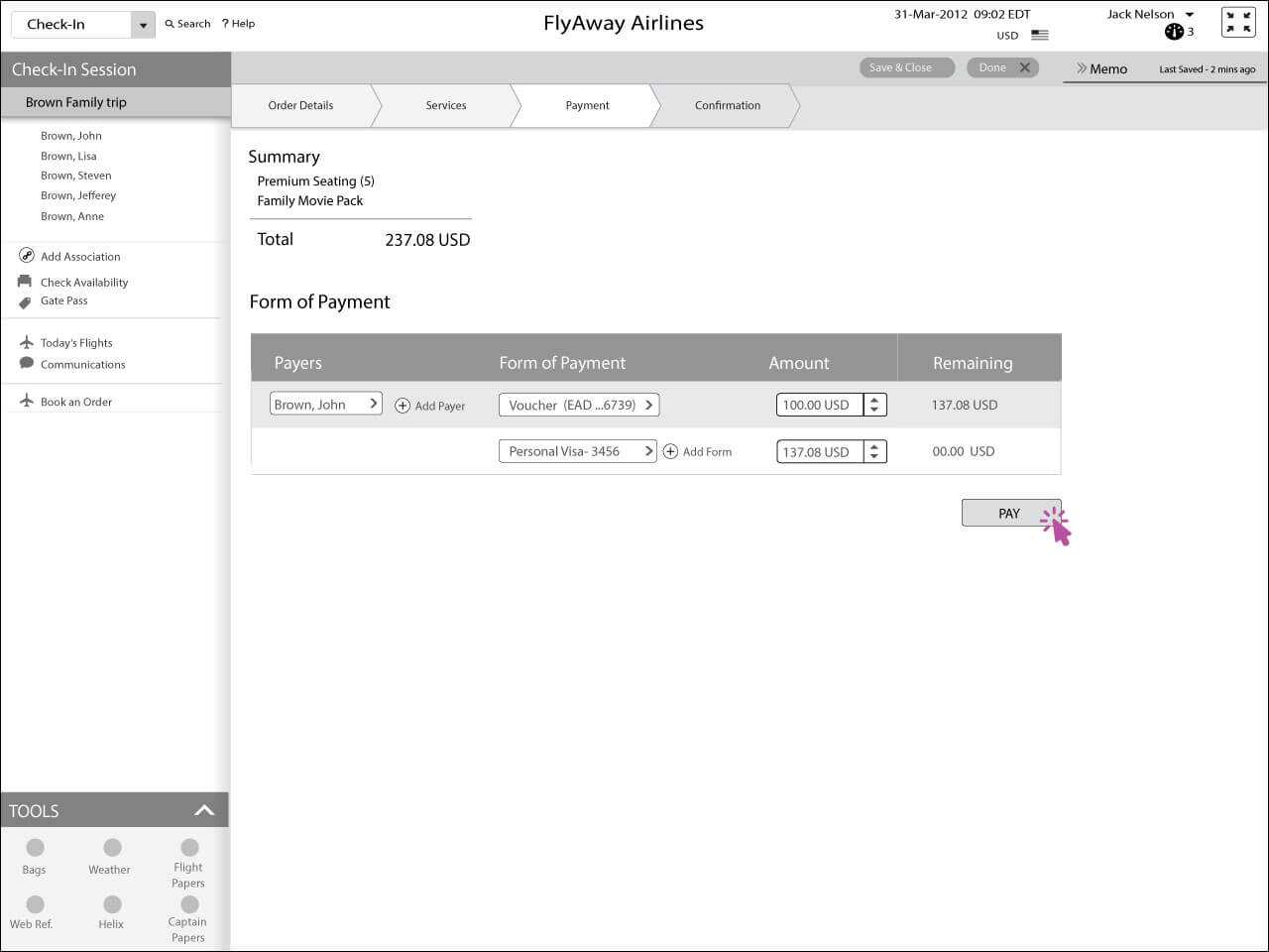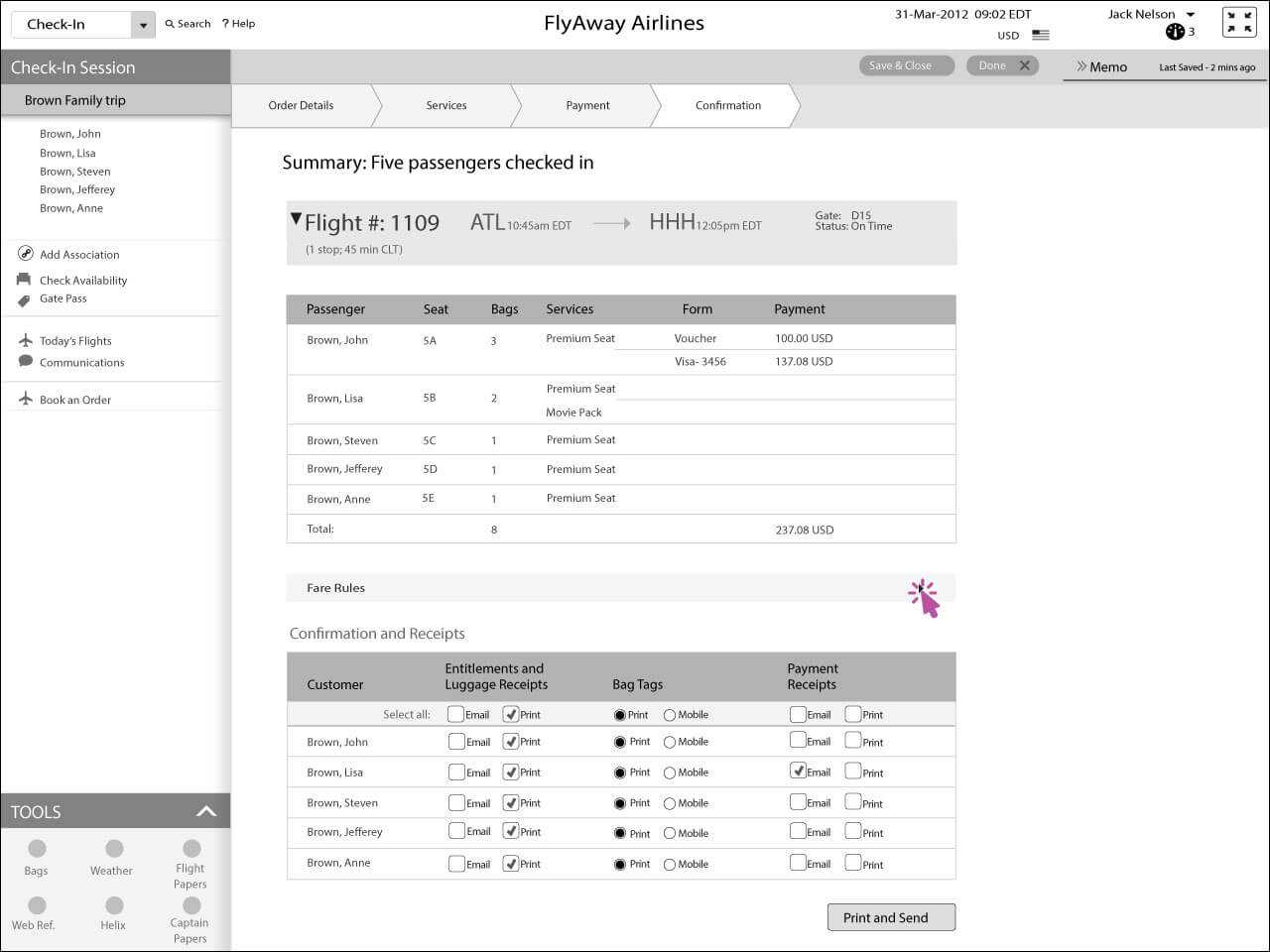 The Brown’s approach the check-in desk of Jack Nelson, the Flyaway Airlines’ check-in agent. Jack pulls up the Brown family’s order by typing John’s name and destination.