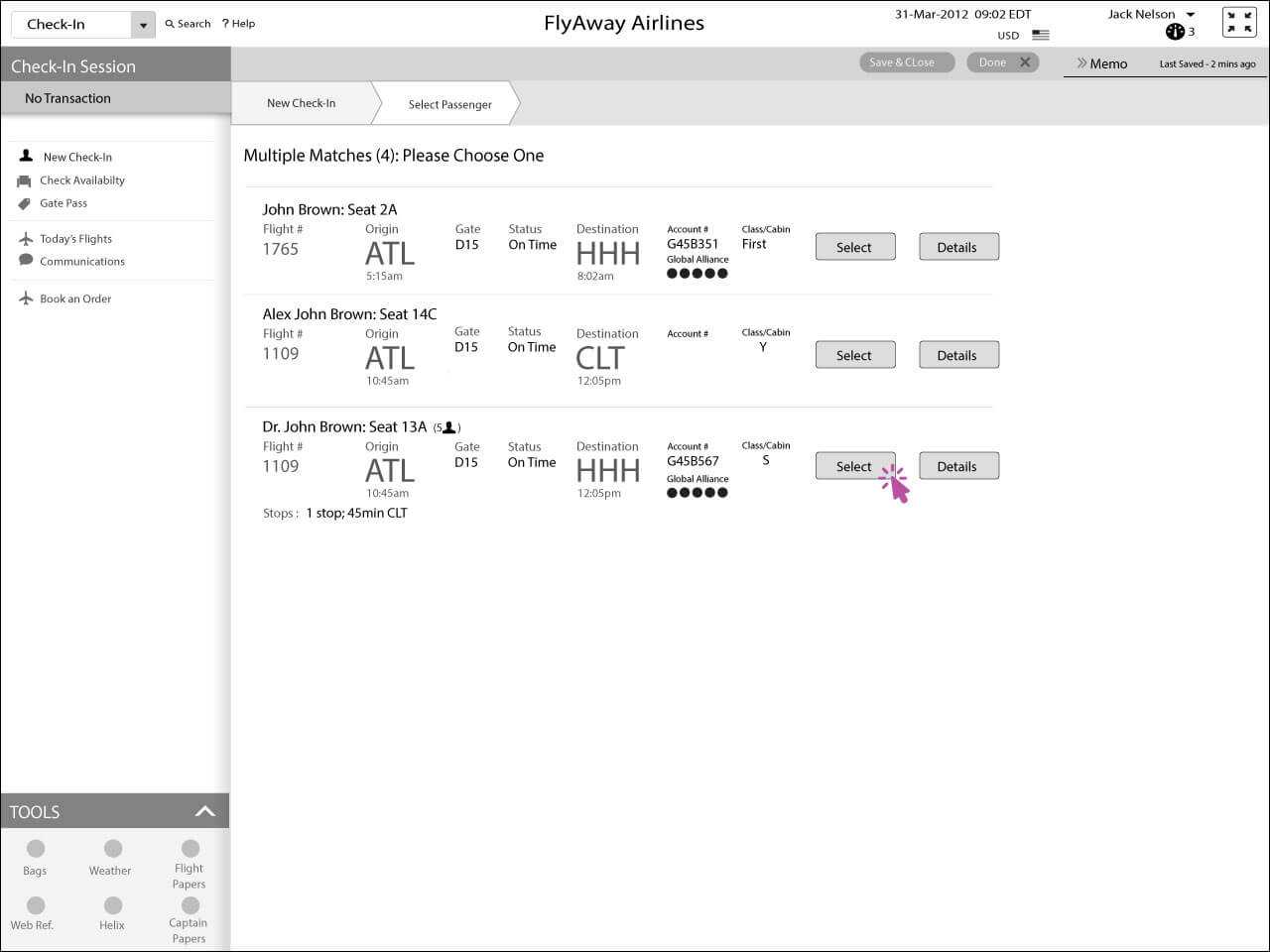 It turns out that there are three people with the same name traveling on the same date. Because the system shows sufficient information for each passenger, Jack is able to select the correct John Brown. Jack could also have clicked Details to see detailed information for each of the passengers, if he needed to.