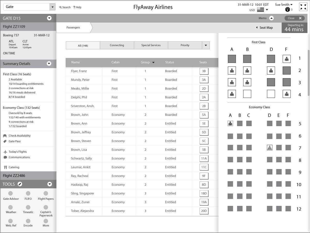 We can see that the Browns are in Group 2, and that John Brown has boarded. The system summarizes how many seats are unsold, how many passengers have entitlements, how many connections are at risk, and how many passengers have boarded in each class of service.
