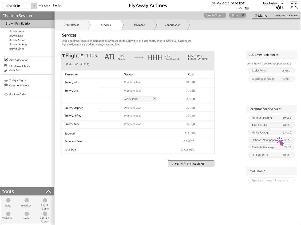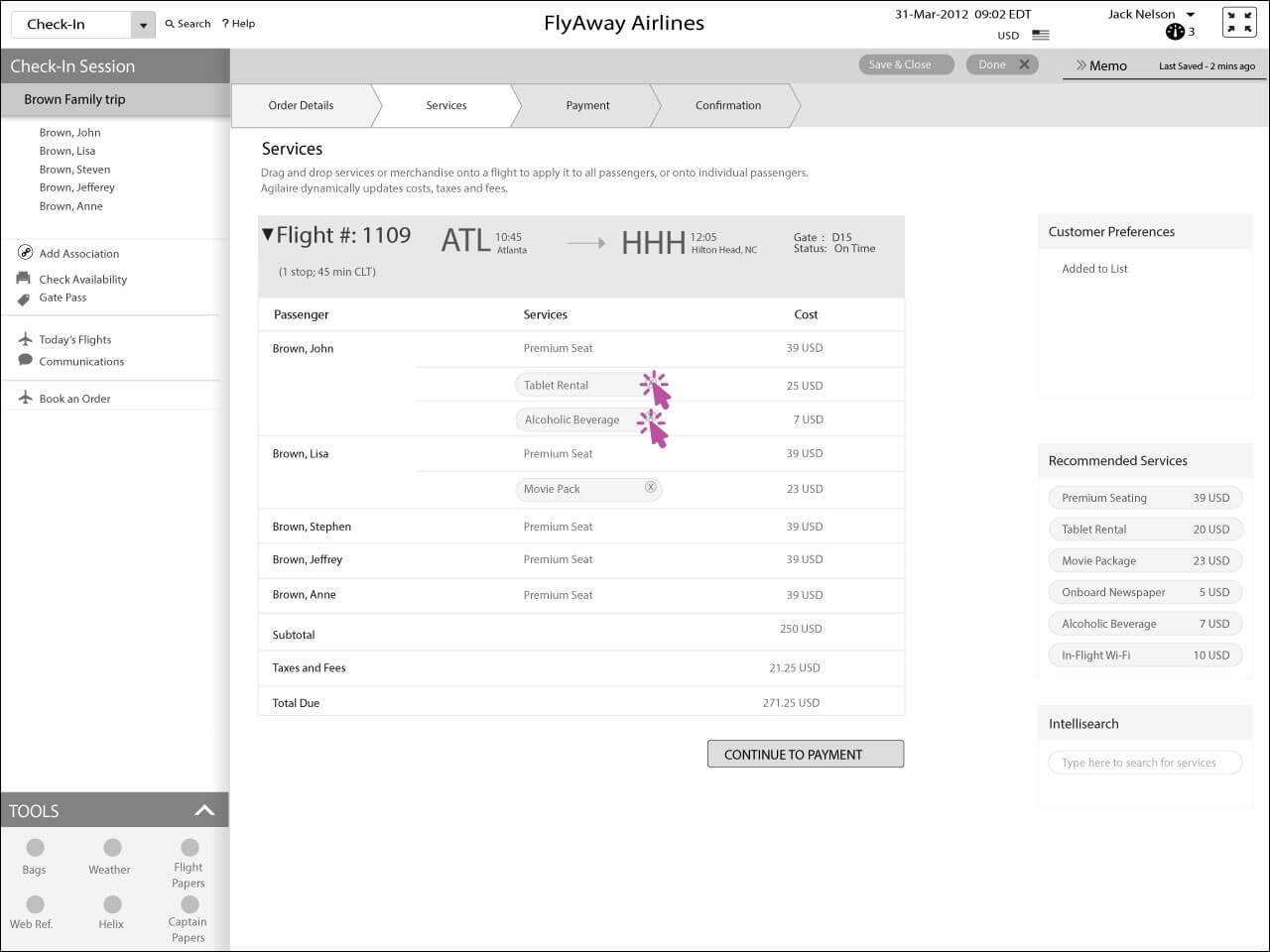 The family wants to add a golf bag for free, and Lynette agrees to do so. She drags the golf bag to John, and then drags InFlight WiFi as an amenity to the whole Brown family. To do so, she drags the amenity onto the higher level entity, which is the flight (she could also click to select each item, and click to assign it to the appropriate entity).