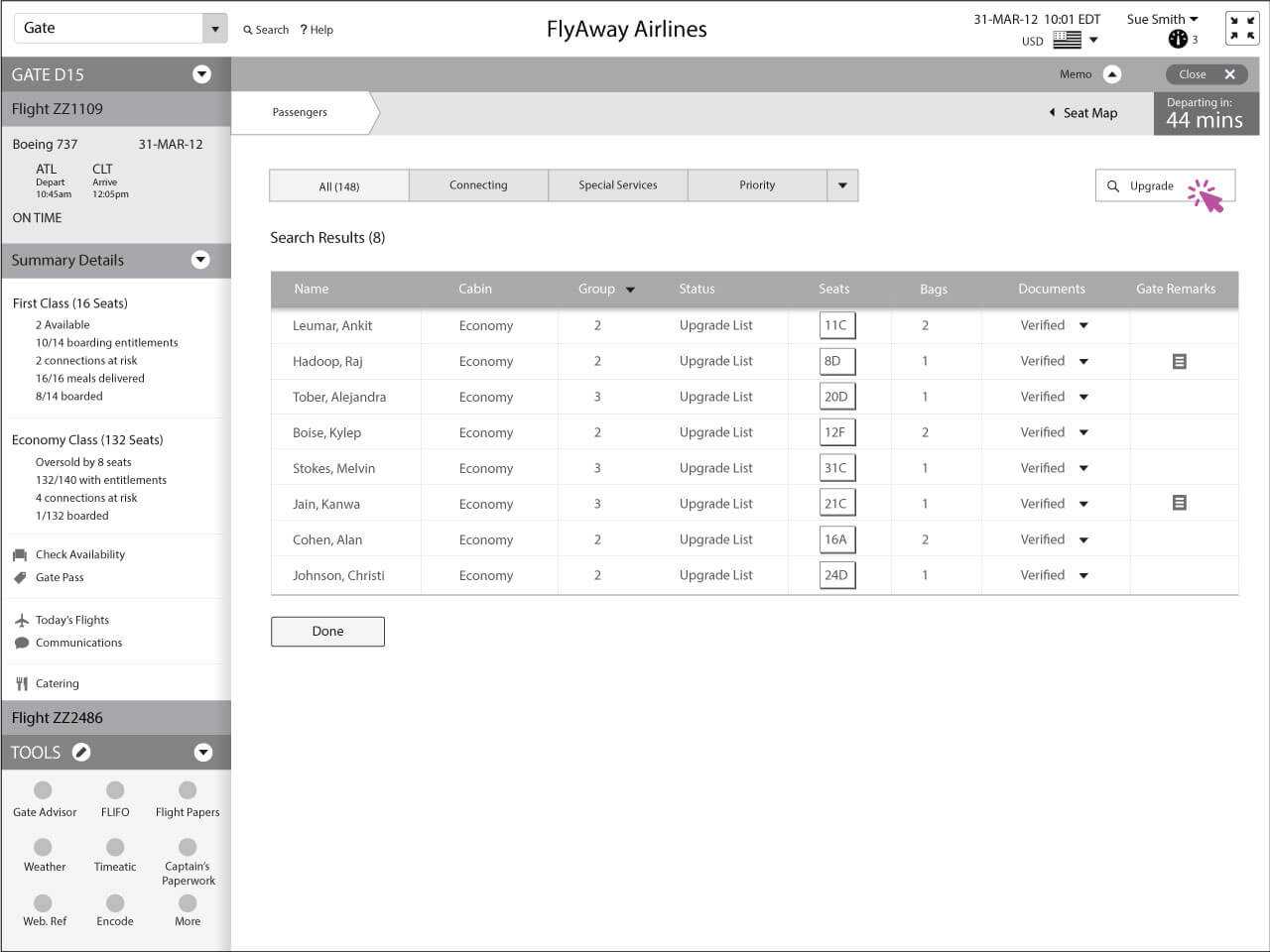 She types Upgrade to show all passengers who have requested upgrades or are on the Upgrade list.