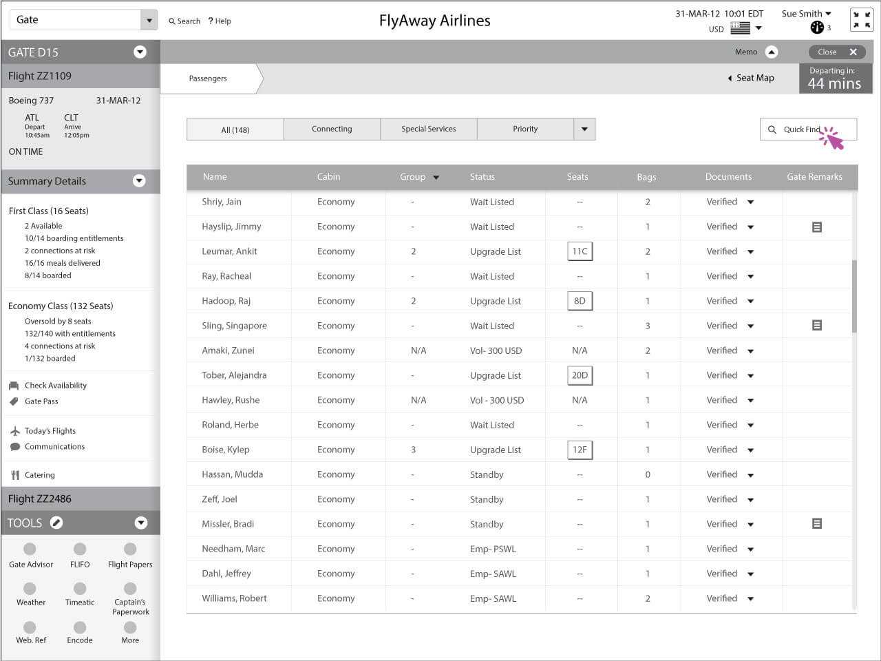 Sue then decides to filter the list of passengers, so she clicks into Quick Find field