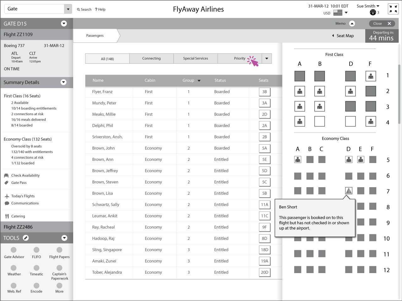 Sue then clicks to view the Priority List (the list of passengers who have an outstanding issue to be addressed before the flight departs).