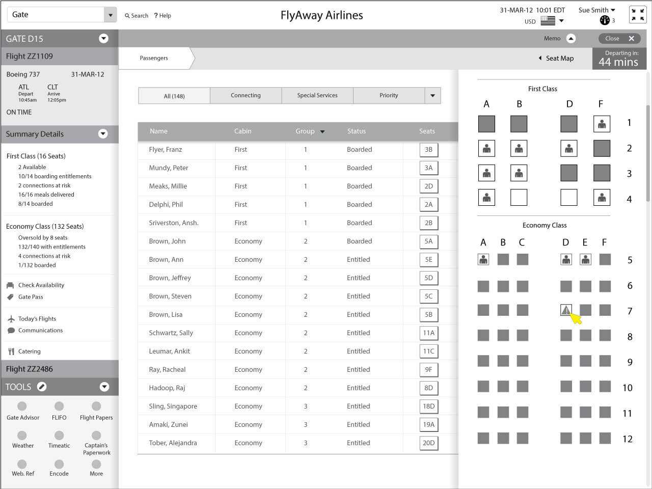 Sue is able to click to view the Seat Map, or click a keyboard shortcut. At this point, she hovers over the Alert for the passenger in Seat D7.