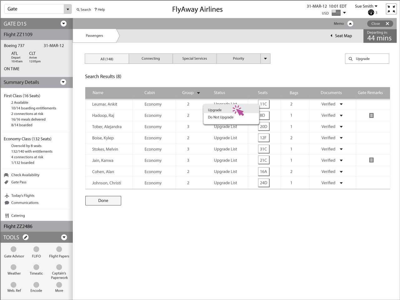 Sue right-clicked on the name of the first passenger in the list, and now selects Upgrade.