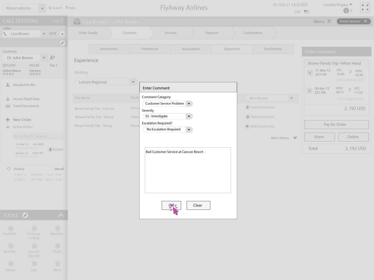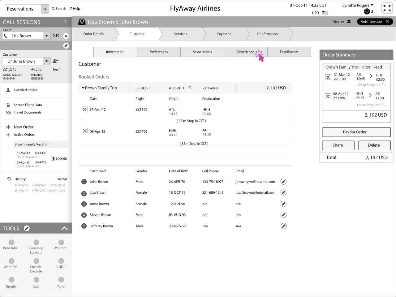 In the first part of the scenario, Lisa calls the FlyAway Airlines Call Center and is connected to Karen, an airline call center representative. The caller ID system provides the phone number the call is coming from, which enables the system to pull up the customer profile linked to the phone number (linked to John). With Mr. Brown’s profile in front of Karen, she quickly reviews it. However, she hears a woman’s voice, not a man’s. She therefore asks whom she is speaking with, and learns she is speaking with Mrs. Brown (Lisa). Therefore, Karen clicks John Brown’s name, and gets a dropdown, with all of the family members who are associated with Mr. Brown.
