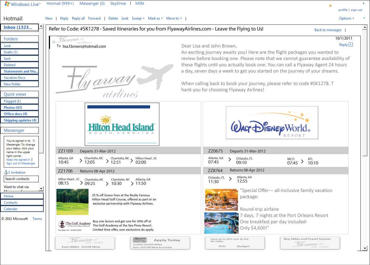 The following email is sent to both John and Lisa. This particular example shows headers for Windows Live email. It includes marketing content for each destination. Note that Lisa and John could choose the option from within the email, and it would update the FlyAway Airlines reservation system.