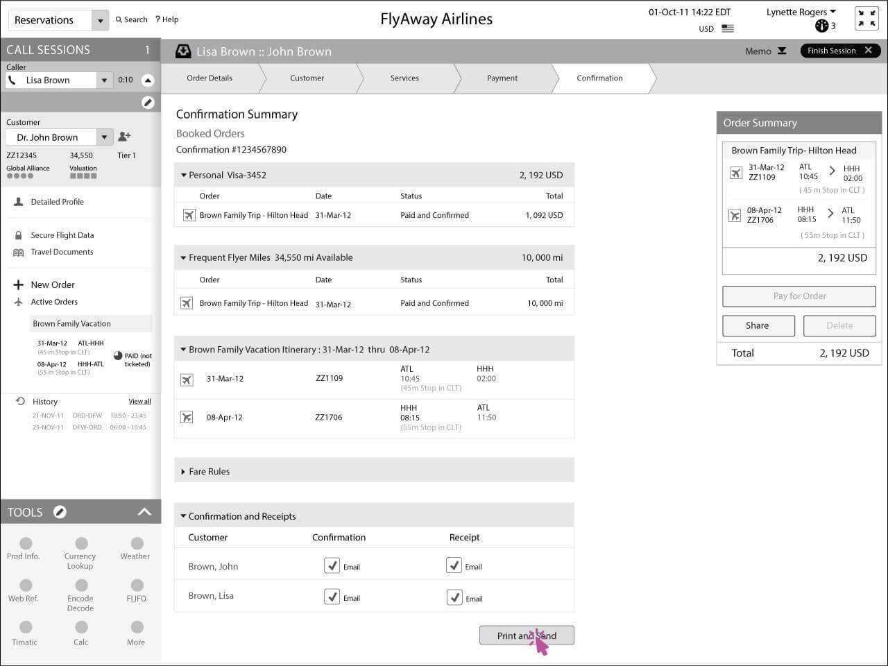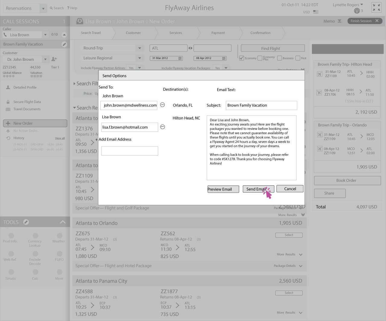The Confirmation screen appears, which enables Lynette to review the details of the selected itinerary. Lisa requests that both she and John receive email confirming the flight, as well as a receipt for the trip.