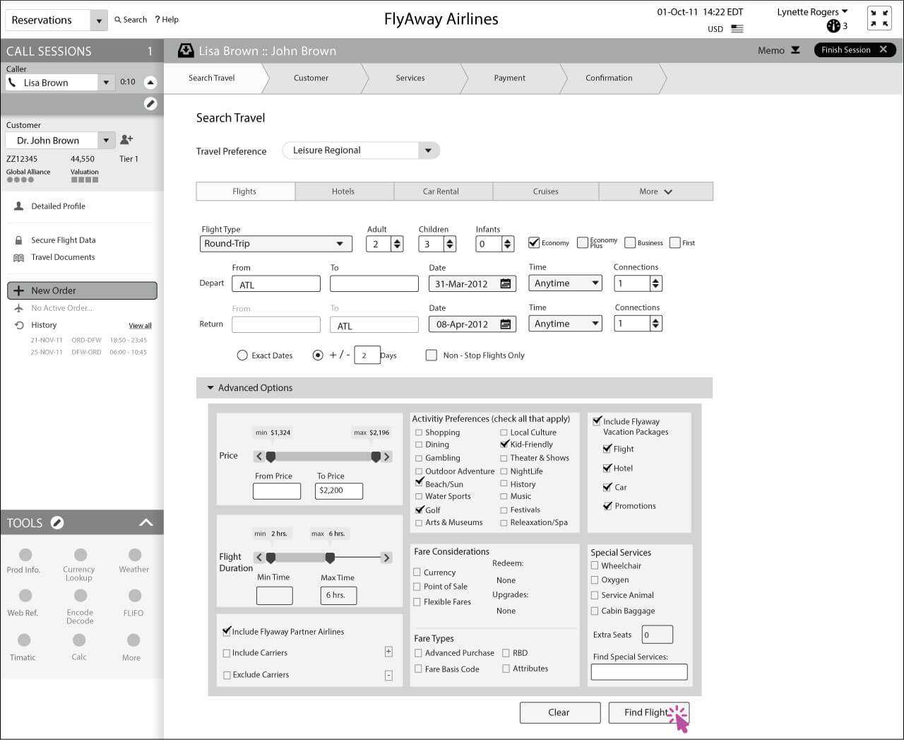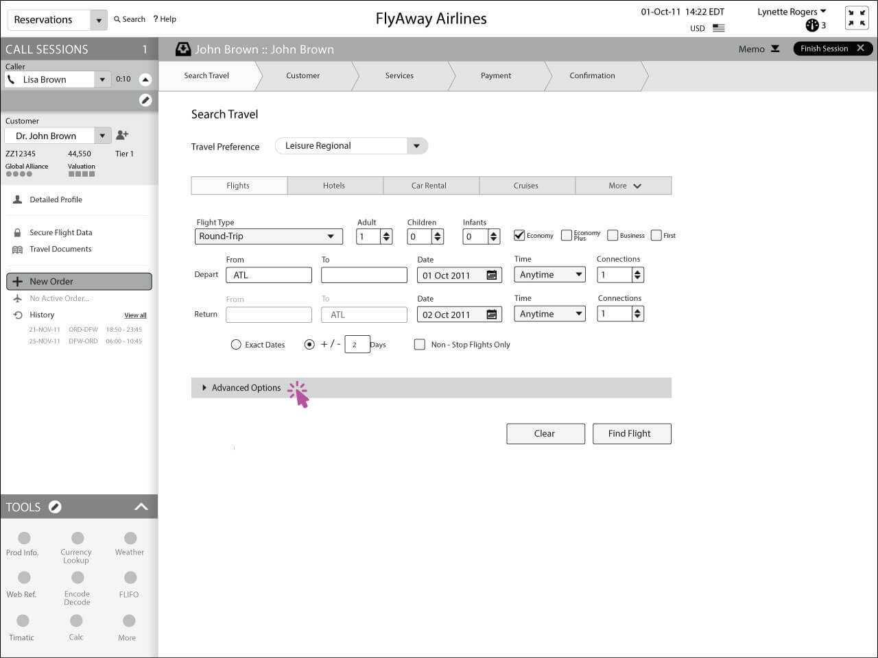 Lisa explains the family’s plans. Because Lisa’s trip is based less on destination, and more on objectives, Karen has to select Advanced Options. Note that we wanted to make the basic search simple, and enable advanced options with a single click or keyboard shortcut.
